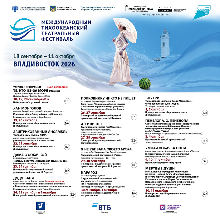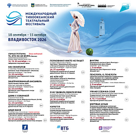 IV Международный Тихоокеанский театральный фестиваль пройдет во Владивостоке с 18 сентября по 11 октября 2026 года. Программа состоит из 13 спектаклей разных жанров, созданных театральными деятелями из 13 стран мира – Армении, Беларуси, Бразилии, Индии, Казахстана, Китая, Колумбии, Малайзии, Мексики, Монголии, России, Франции и ЮАР.